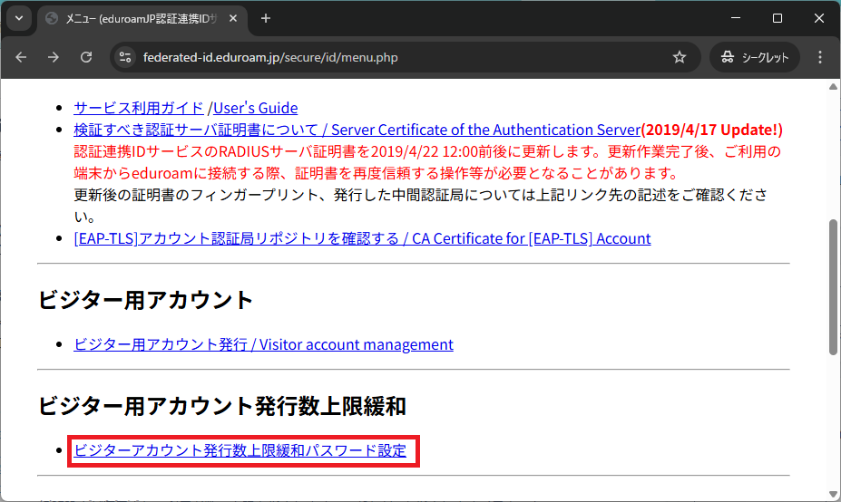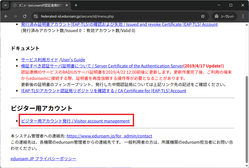 2. 「ビジター用アカウント発行機能 / Visitor account management」をクリックします.