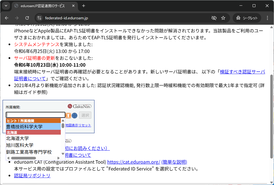 1. https://federated-id.eduroam.jp/ にアクセスします.所属機関に「豊橋技術科学大学」を選択し,情報メディア基盤センターのアカウントでログインします.