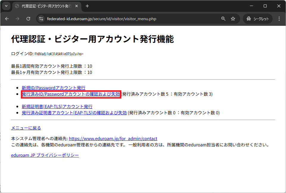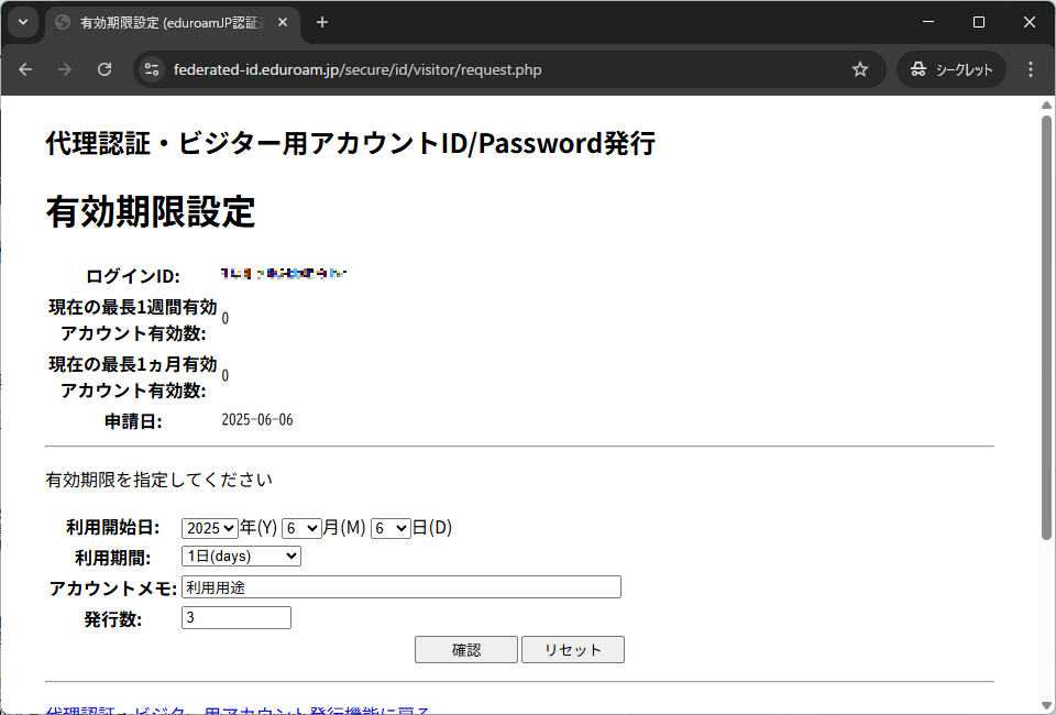 1. 発行手続きの手順3の「代理認証・ビジター用アカウント発行機能」の画面を開きます.