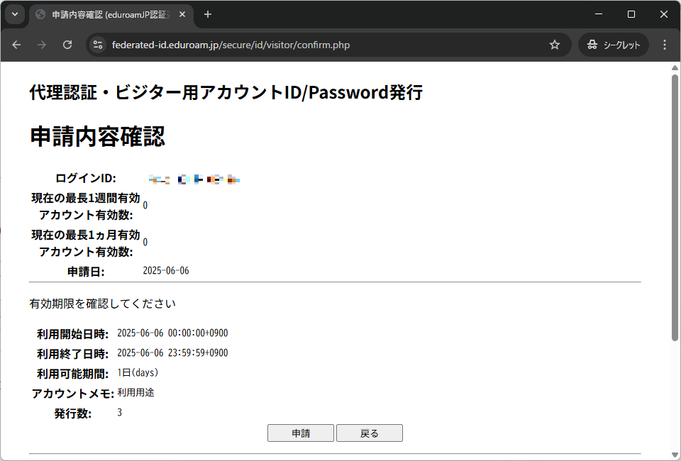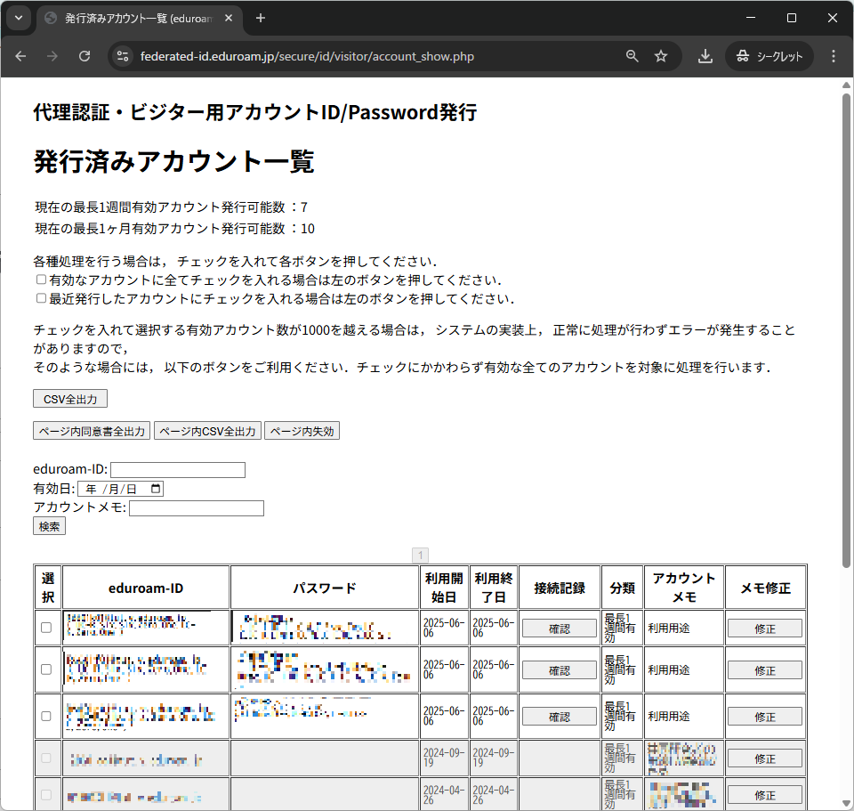 4. 以上の設定で上限緩和が適用されています.アカウント発行手順は,ゲスト用eduroamアカウント発行方法にしたがいます.