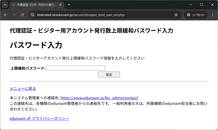 2. 発行手続きの手順2の「代理認証・ビジター用アカウント発行機能」の画面を開きます.「 ビジター用アカウント発行数上限緩和パスワード設定」より設定を行います.